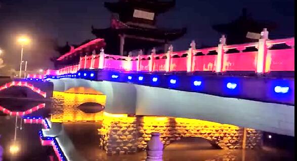 太平橋用隱藏式的瓦楞投光燈照亮建筑屋面,變幻四季顏色,絢麗多彩,形成一定的韻律感,河中倒影給人波光粼粼的勝境,整體氣勢(shì)恢弘,在橋的欄桿下一側(cè)用定制的祥云圖案燈順序排列,寓意祥和、太平,突出太平盛世文化。
